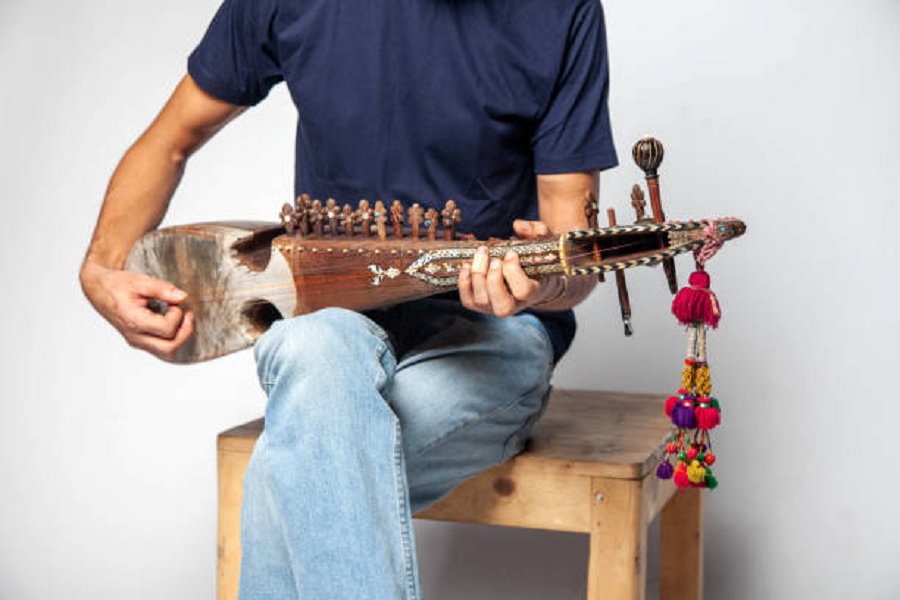 The Sarod is an instrument derived from the Central and South Asian instrument the Rubab or Rabab. This string instrument has a metal fingerboard with no frets, and numerous strings. The membrane covering provides resonance in the sound chamber. It is usually played with a coconut pick. The Sarod is used in many parts of Pakistan including Baluchistan and Azad Kashmir (first image from Bina, second image and information from Courtney 2004).